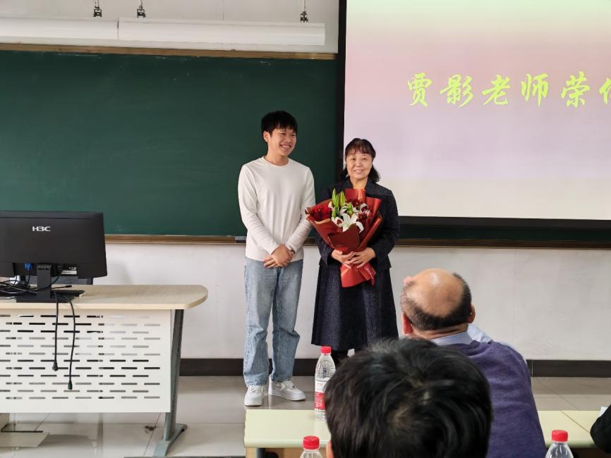 活动中,全体师生还为即将荣休的贾影老师举行了温馨的欢送仪式。学生代表阳云明向贾影老师献上鲜花。贾影老师回顾了自己三十七载从教生涯,分享了育人初心与执教感悟,言辞间充满对教育事业和学院师生的深厚感情。